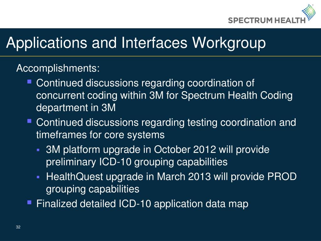 Applications and Interfaces Workgroup Accomplishments: • Continued discussions regarding coordination of concurrent coding within 3M for Spectrum Health Coding department in 3M • Continued discussions regarding testing coordination and timeframes for core systems • 3M platform upgrade in October 2012 will provide preliminary ICD-10 grouping capabilities • HealthQuest upgrade in March 2013 will provide PROD grouping capabilities • Finalized detailed ICD-10 application data map