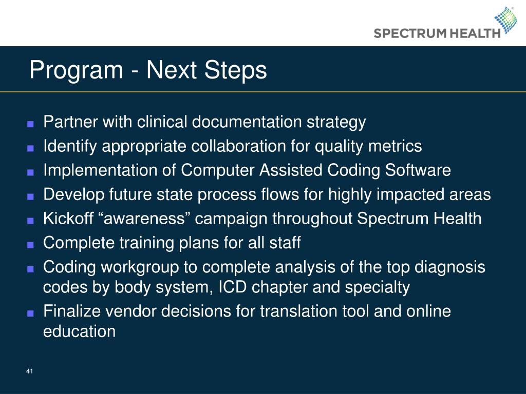 Program - Next Steps • Partner with clinical documentation strategy • Identify appropriate collaboration for quality metrics • Implementation of Computer Assisted Coding Software • Develop future state process flows for highly impacted areas • Kickoff “awareness” campaign throughout Spectrum Health • Complete training plans for all staff • Coding workgroup to complete analysis of the top diagnosis codes by body system, ICD chapter and specialty • Finalize vendor decisions for translation tool and online education