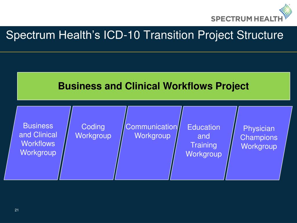 Spectrum Health’s ICD-10 Transition Project Structure Business and Clinical Workflows Project Business and Clinical Workflows Workgroup Coding Workgroup Communication Workgroup Education and Training Workgroup Physician Champions Workgroup
