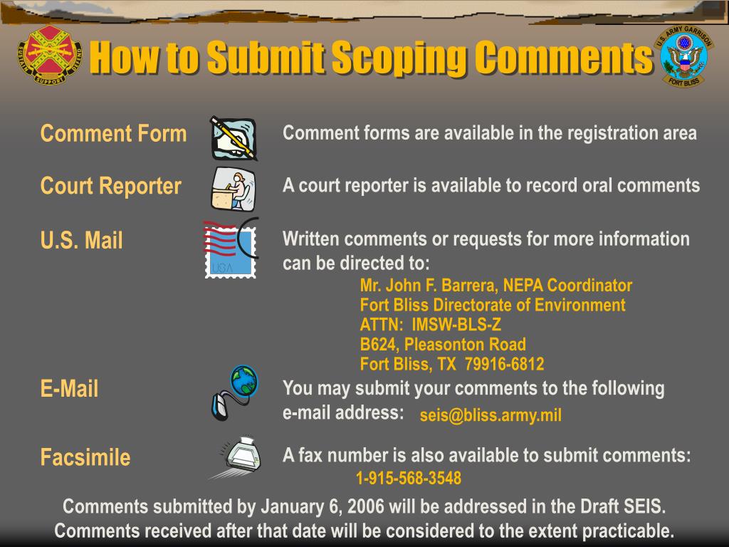 Comment Form Comment forms are available in the registration area Court Reporter A court reporter is available to record oral comments U.S. Mail Written comments or requests for more information can be directed to: Mr. John F. Barrera, NEPA Coordinator Fort Bliss Directorate of Environment ATTN: IMSW-BLS-Z B624, Pleasonton Road Fort Bliss, TX 79916-6812 E-Mail You may submit your comments to the following e-mail address: seis@bliss.army.mil Facsimile A fax number is also available to submit comments:1-915-568-3548 How to Submit Scoping Comments Comments submitted by January 6, 2006 will be addressed in the Draft SEIS. Comments received after that date will be considered to the extent practicable.
