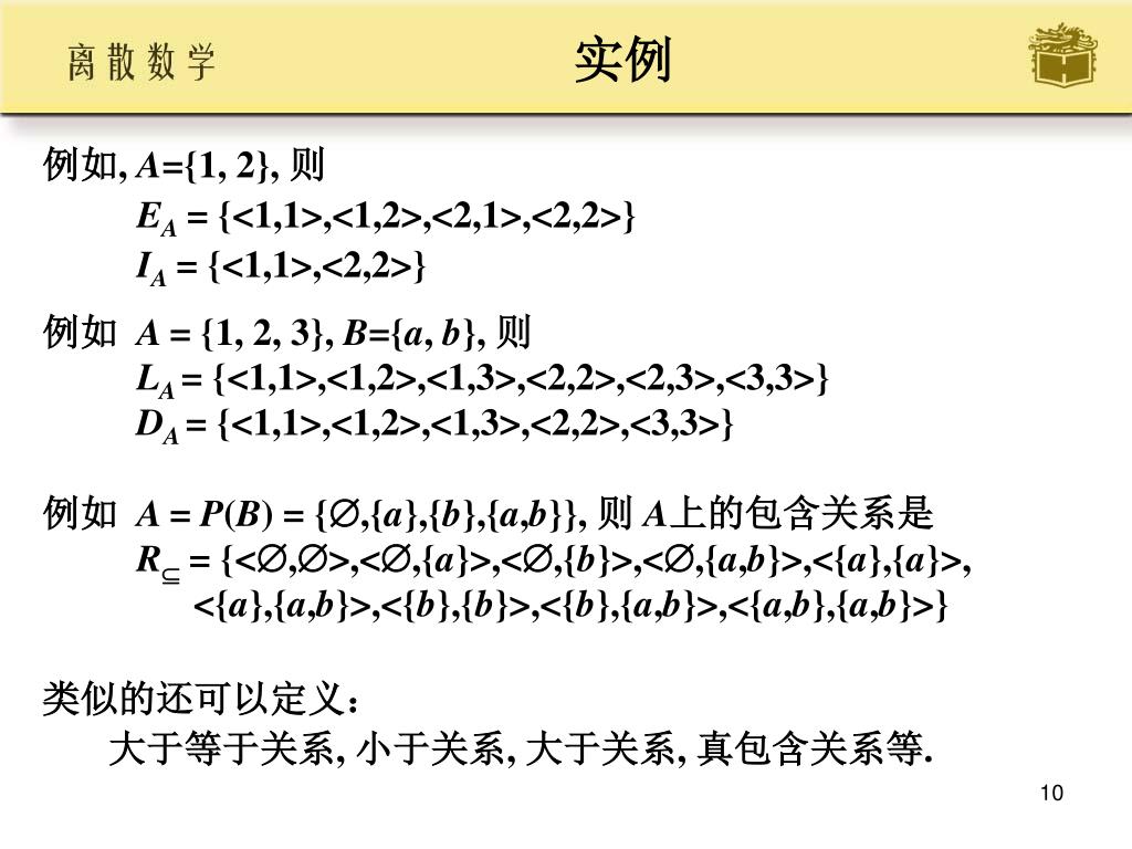 实例 • 例如, A={1, 2}, 则 • EA= {<1,1>,<1,2>,<2,1>,<2,2>} • IA= {<1,1>,<2,2>} • 例如 A = {1, 2, 3}, B={a, b}, 则LA = {<1,1>,<1,2>,<1,3>,<2,2>,<2,3>,<3,3>}DA = {<1,1>,<1,2>,<1,3>,<2,2>,<3,3>} • 例如 A = P(B) = {,{a},{b},{a,b}}, 则 A上的包含关系是R = {<,>,<,{a}>,<,{b}>,<,{a,b}>,<{a},{a}>, • <{a},{a,b}>,<{b},{b}>,<{b},{a,b}>,<{a,b},{a,b}>} • 类似的还可以定义: • 大于等于关系, 小于关系, 大于关系, 真包含关系等.