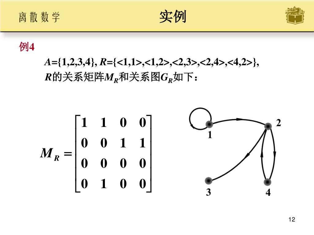 实例 • 例4 • A={1,2,3,4}, R={<1,1>,<1,2>,<2,3>,<2,4>,<4,2>}, • R的关系矩阵MR和关系图GR如下: