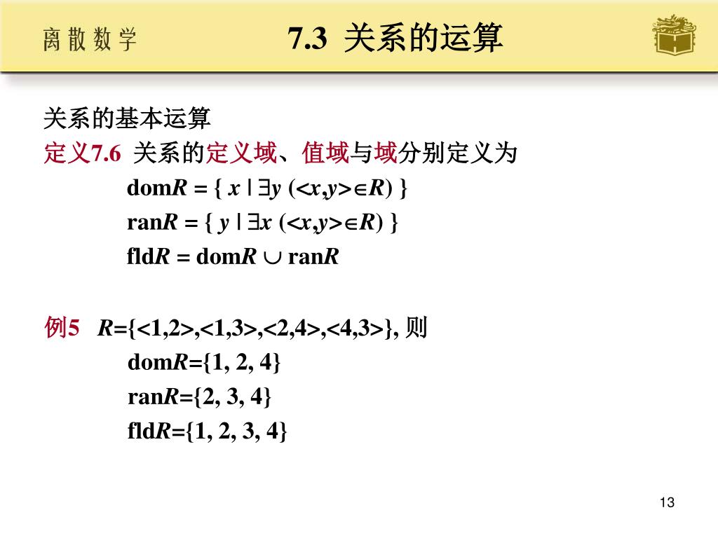 7.3关系的运算 • 关系的基本运算 • 定义7.6 关系的定义域、值域与域分别定义为 • domR = { x | y (<x,y>R) } • ranR = { y | x (<x,y>R) } • fldR = domR ranR • 例5R={<1,2>,<1,3>,<2,4>,<4,3>}, 则 • domR={1, 2, 4} • ranR={2, 3, 4} • fldR={1, 2, 3, 4}