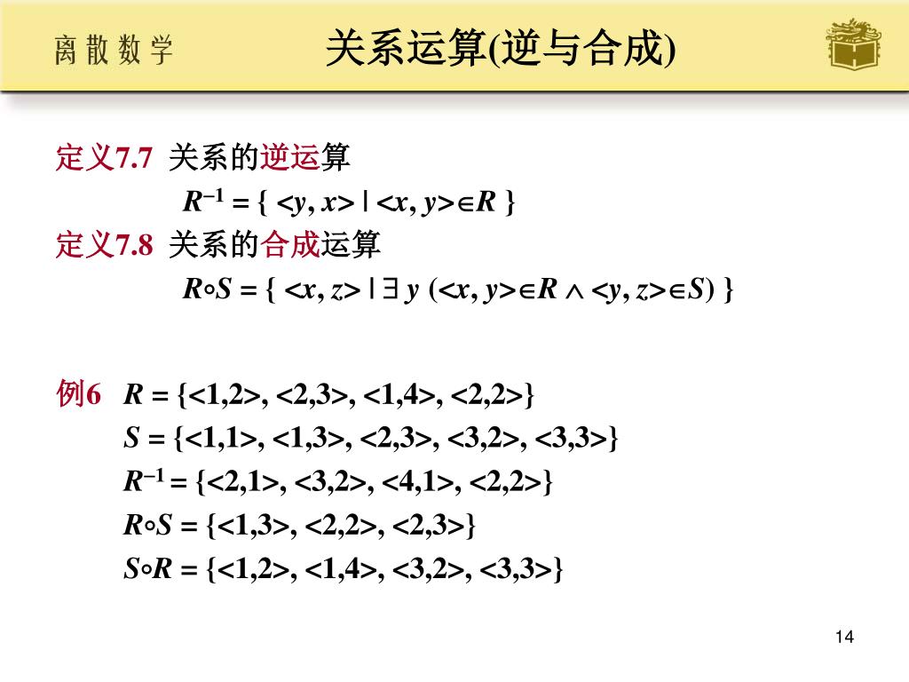 关系运算(逆与合成) • 定义7.7关系的逆运算 • R1 = { <y, x> | <x, y>R } • 定义7.8关系的合成运算 • RS = { <x, z> | y (<x, y>R <y, z>S) } • 例6R = {<1,2>, <2,3>, <1,4>, <2,2>} • S = {<1,1>, <1,3>, <2,3>, <3,2>, <3,3>} • R1 = {<2,1>, <3,2>, <4,1>, <2,2>} • RS = {<1,3>, <2,2>, <2,3>} • SR = {<1,2>, <1,4>, <3,2>, <3,3>}