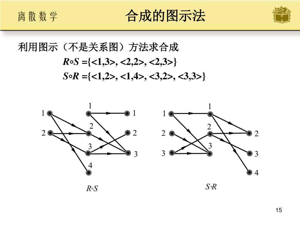 合成的图示法 • 利用图示(不是关系图)方法求合成 • RS ={<1,3>, <2,2>, <2,3>} • SR ={<1,2>, <1,4>, <3,2>, <3,3>}