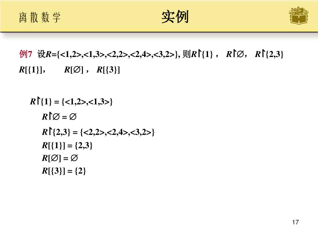 实例 • 例7设R={<1,2>,<1,3>,<2,2>,<2,4>,<3,2>}, 则R↾{1} , R↾, R↾{2,3} • R[{1}], R[] , R[{3}] • R↾{1} = {<1,2>,<1,3>} R↾ = R↾{2,3} = {<2,2>,<2,4>,<3,2>} R[{1}] = {2,3} R[] = R[{3}] = {2}