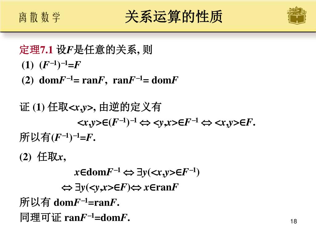 关系运算的性质 • 定理7.1设F是任意的关系, 则 • (1) (F1)1=F • (2) domF1= ranF, ranF1= domF • 证 (1) 任取<x,y>, 由逆的定义有 • <x,y>∈(F1)1 <y,x>∈F1 <x,y>∈F. • 所以有(F1)1=F. • (2) 任取x, • x∈domF1y(<x,y>∈F1) • y(<y,x>∈F)x∈ranF • 所以有 domF1=ranF. • 同理可证 ranF1=domF.