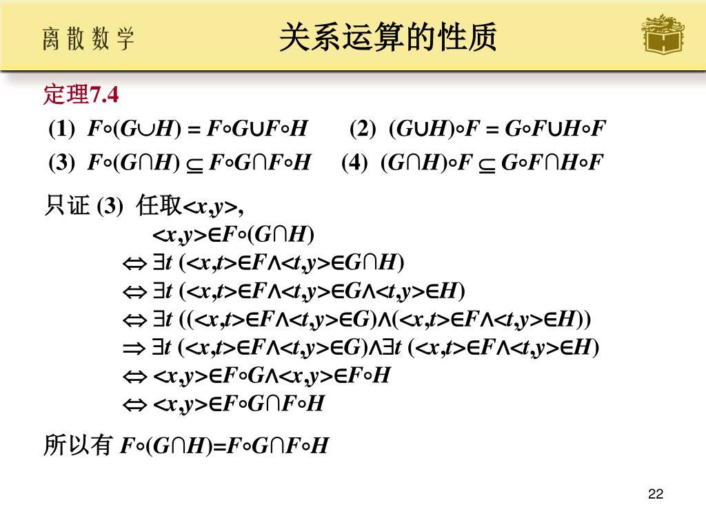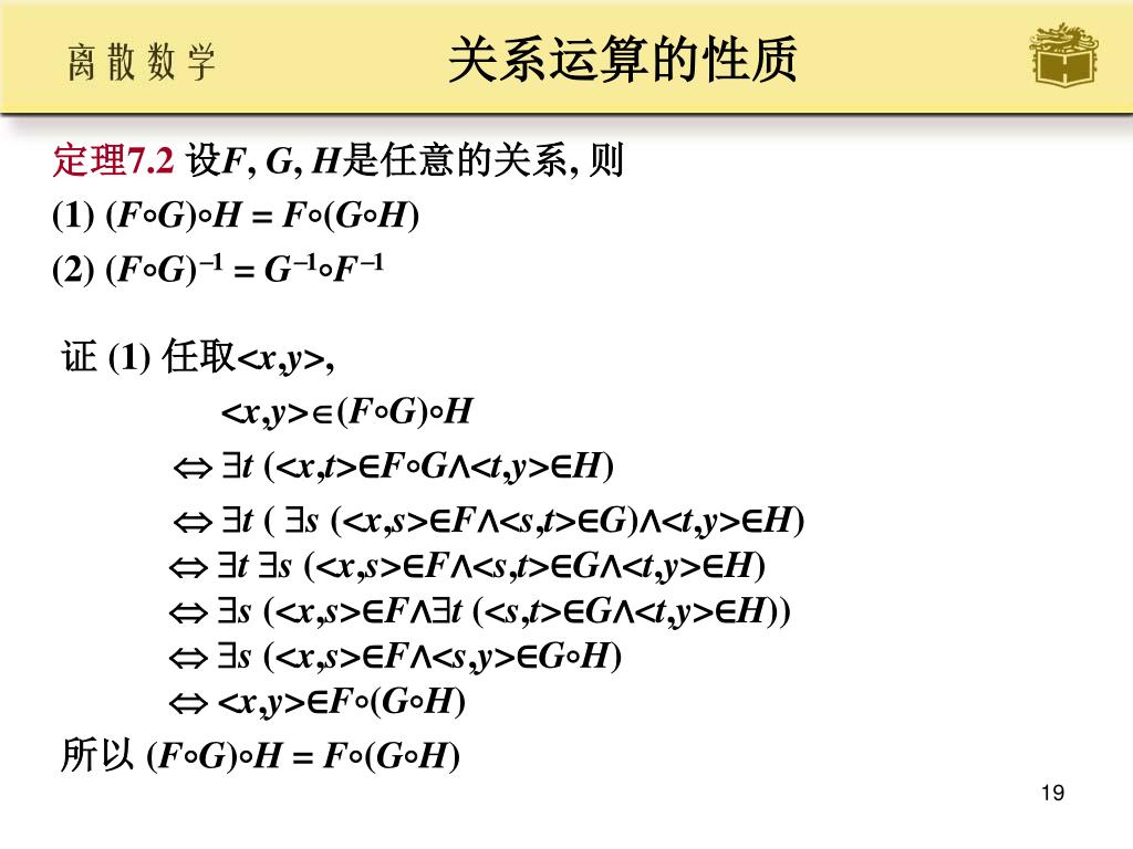 关系运算的性质 • 定理7.2设F, G, H是任意的关系, 则 • (1) (FG)H = F(GH) • (2) (FG)1 = G1F1 • 证 (1) 任取<x,y>, • <x,y>(FG)H • t (<x,t>∈FG∧<t,y>∈H) • t ( s (<x,s>∈F∧<s,t>∈G)∧<t,y>∈H) t s (<x,s>∈F∧<s,t>∈G∧<t,y>∈H)s (<x,s>∈F∧t (<s,t>∈G∧<t,y>∈H))s (<x,s>∈F∧<s,y>∈GH) <x,y>∈F(GH) • 所以 (FG)H = F(GH)