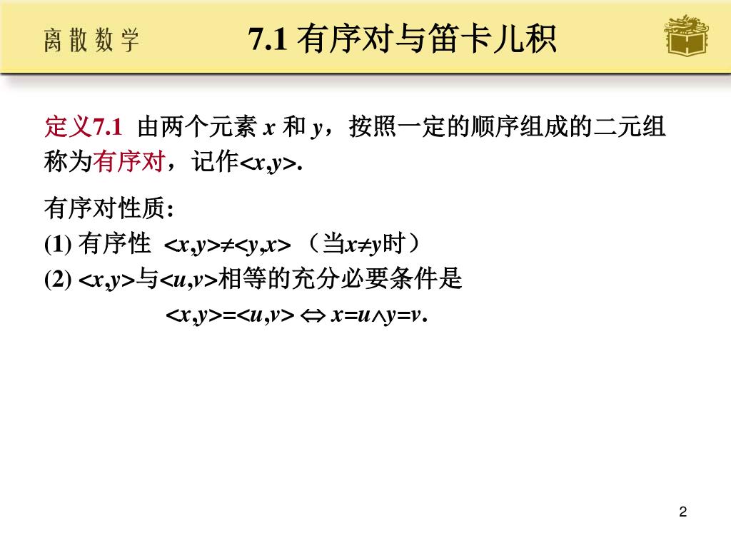 7.1 有序对与笛卡儿积 • 定义7.1由两个元素 x 和 y,按照一定的顺序组成的二元组 • 称为有序对,记作<x,y>. • 有序对性质: • (1) 有序性 <x,y><y,x> (当xy时) • (2) <x,y>与<u,v>相等的充分必要条件是 • <x,y>=<u,v> x=uy=v.