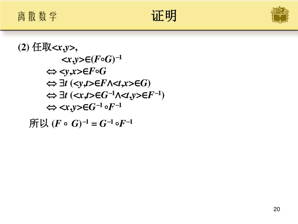 证明 • (2) 任取<x,y>, <x,y>∈(FG)1 <y,x>∈FG t (<y,t>∈F∧<t,x>∈G) t (<x,t>∈G1∧<t,y>∈F1) <x,y>∈G1 F1所以 (F G)1 = G1 F1
