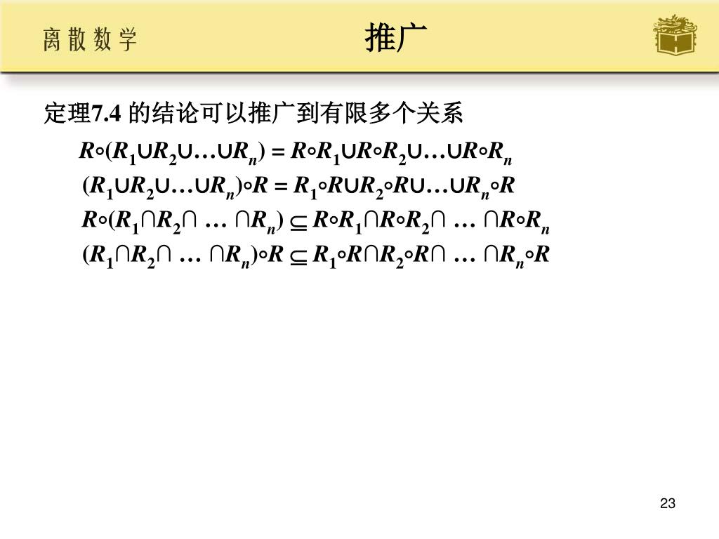 推广 • 定理7.4的结论可以推广到有限多个关系 • R(R1∪R2∪…∪Rn) = RR1∪RR2∪…∪RRn (R1∪R2∪…∪Rn)R = R1R∪R2R∪…∪RnRR(R1∩R2∩ … ∩Rn) RR1∩RR2∩ … ∩RRn (R1∩R2∩ … ∩Rn)R R1R∩R2R∩ … ∩RnR