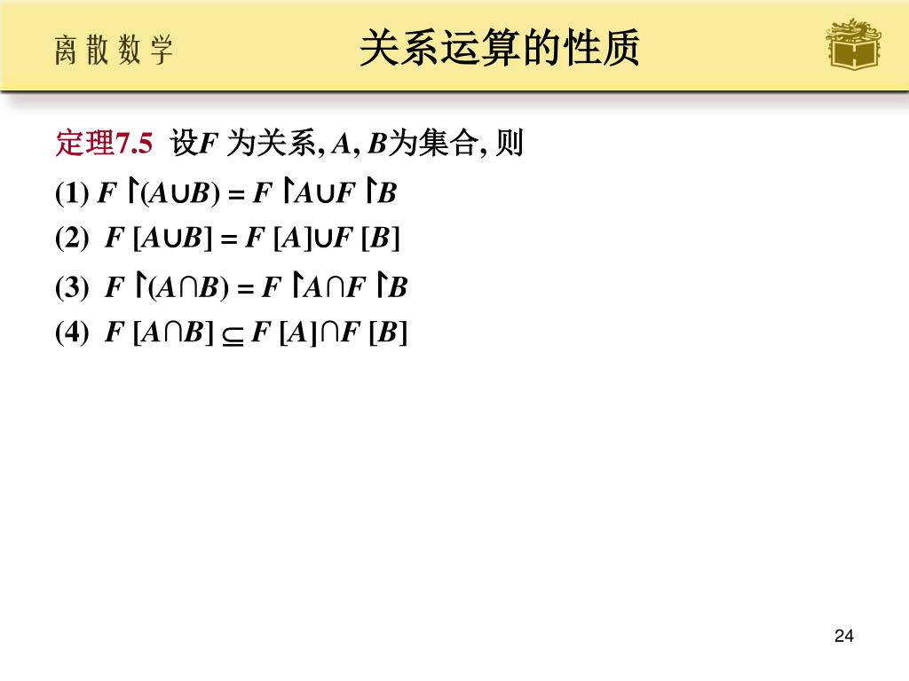 关系运算的性质 • 定理7.5设F 为关系, A, B为集合, 则 • (1) F ↾(A∪B) = F ↾A∪F ↾B • (2) F [A∪B] = F [A]∪F [B] • (3) F ↾(A∩B) = F ↾A∩F ↾B • (4) F [A∩B] F [A]∩F [B]
