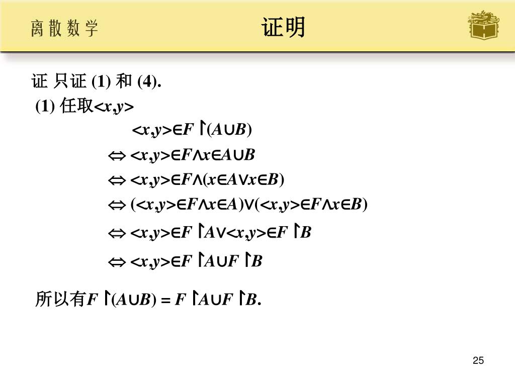 证明 • 证 只证 (1) 和 (4). • (1) 任取<x,y> <x,y>∈F ↾(A∪B) • <x,y>∈F∧x∈A∪B • <x,y>∈F∧(x∈A∨x∈B) • (<x,y>∈F∧x∈A)∨(<x,y>∈F∧x∈B) • <x,y>∈F ↾A∨<x,y>∈F ↾B • <x,y>∈F ↾A∪F ↾B • 所以有F ↾(A∪B) = F ↾A∪F ↾B.