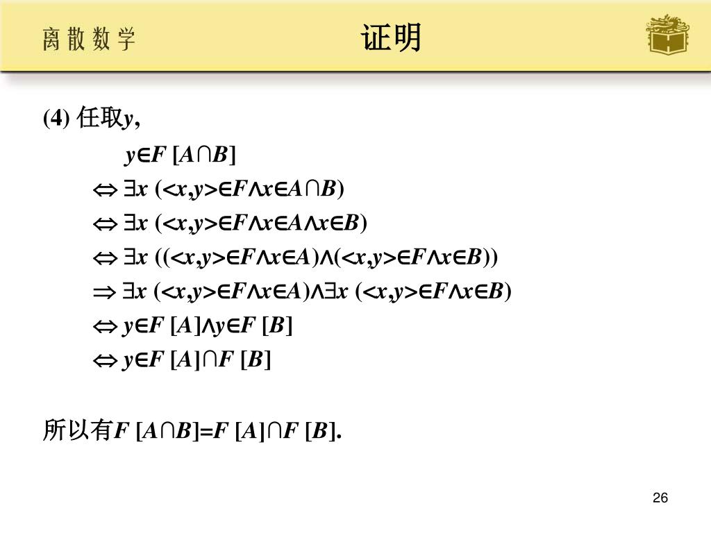 证明 • (4) 任取y, • y∈F [A∩B]x (<x,y>∈F∧x∈A∩B)x (<x,y>∈F∧x∈A∧x∈B)x ((<x,y>∈F∧x∈A)∧(<x,y>∈F∧x∈B))x (<x,y>∈F∧x∈A)∧x (<x,y>∈F∧x∈B)y∈F [A]∧y∈F [B]y∈F [A]∩F [B] • 所以有F [A∩B]=F [A]∩F [B].