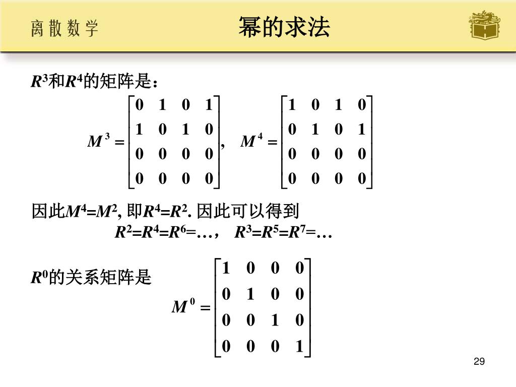 幂的求法 • R3和R4的矩阵是: • 因此M4=M2, 即R4=R2. 因此可以得到 R2=R4=R6=…, R3=R5=R7=… • R0的关系矩阵是 •