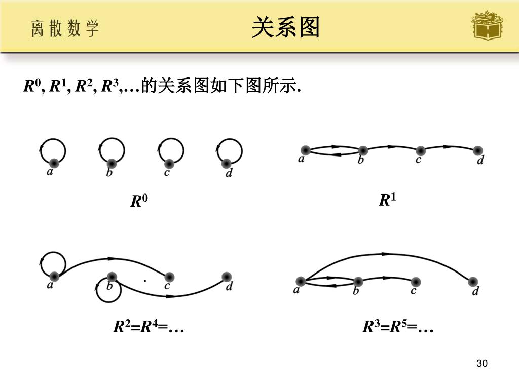 关系的幂运算 • 定义7.10 • 设 R 为 A 上的关系, n为自然数, 则 R 的 n 次幂定义为: • (1) R0 = { <x,x> | x∈A } = IA • (2)Rn+1 = RnR • 注意: • 对于A上的任何关系 R1 和 R2 都有 R10 = R20 = IA • 对于A上的任何关系 R 都有 R1 = R