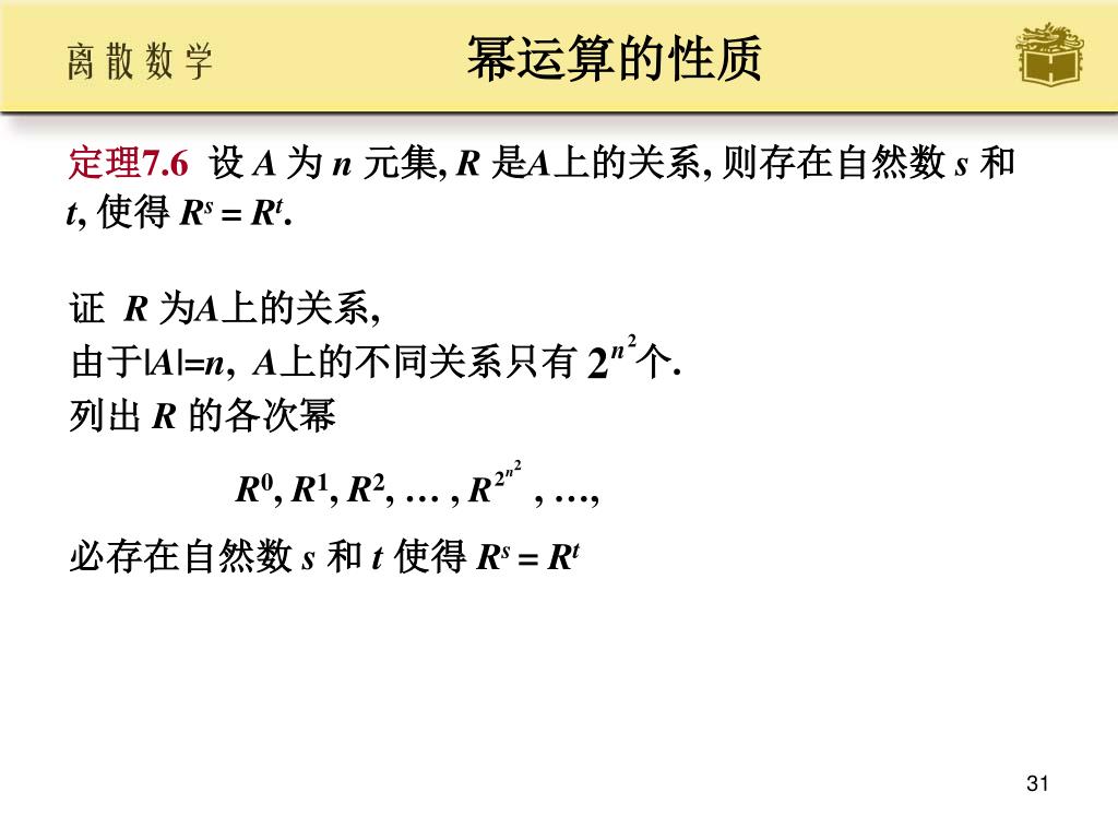 证 R 为A上的关系, • 由于|A|=n, A上的不同关系只有 个. • 列出 R 的各次幂 • R0, R1, R2, … , , …, • 必存在自然数 s 和 t 使得 Rs = Rt 幂运算的性质 • 定理7.6设 A 为 n 元集, R 是A上的关系, 则存在自然数 s 和 • t, 使得 Rs = Rt.