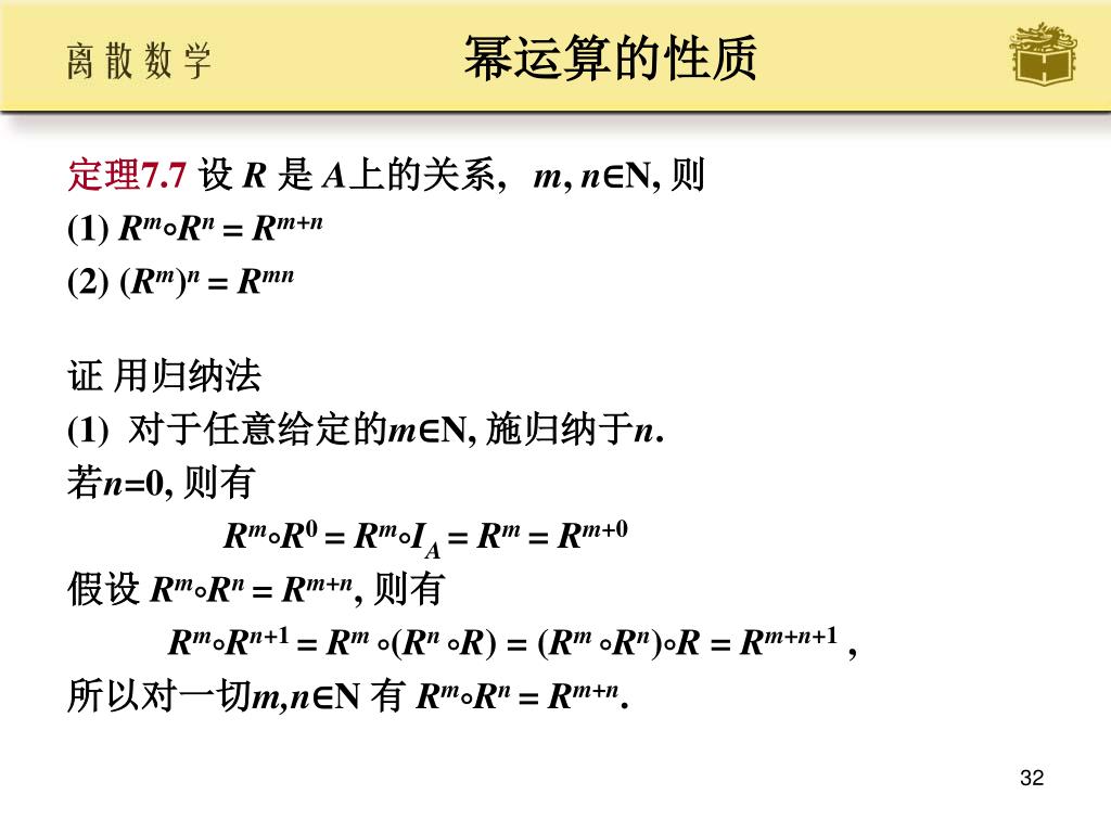 幂运算的性质 • 定理7.7设 R 是 A上的关系, m, n∈N, 则 • (1) RmRn = Rm+n • (2) (Rm)n = Rmn • 证 用归纳法 • (1) 对于任意给定的m∈N, 施归纳于n. • 若n=0, 则有 • RmR0 = RmIA = Rm = Rm+0 • 假设 RmRn = Rm+n, 则有 • RmRn+1= Rm (Rn R) = (Rm Rn)R = Rm+n+1 , • 所以对一切m,n∈N 有 RmRn = Rm+n.