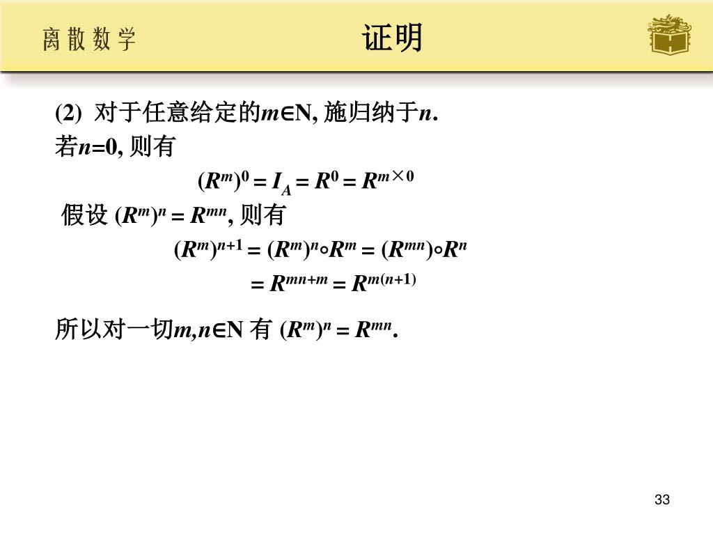 证明 • (2) 对于任意给定的m∈N, 施归纳于n. • 若n=0, 则有 • (Rm)0 = IA = R0= Rm×0 • 假设 (Rm)n = Rmn, 则有 • (Rm)n+1= (Rm)nRm = (Rmn)Rn • = Rmn+m = Rm(n+1) • 所以对一切m,n∈N 有 (Rm)n = Rmn.