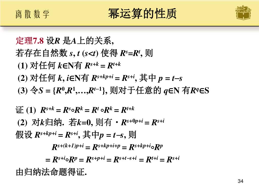 幂运算的性质 • 定理7.8设R是A上的关系, • 若存在自然数 s, t (s<t) 使得 Rs=Rt, 则 • (1) 对任何 k∈N有 Rs+k = Rt+k • (2) 对任何 k, i∈N有 Rs+kp+i = Rs+i, 其中 p = ts • (3) 令S = {R0,R1,…,Rt1}, 则对于任意的 q∈N 有Rq∈S • 证 (1) Rs+k = RsRk = Rt Rk = Rt+k • (2) 对k归纳. 若k=0, 则有Rs+0p+i = Rs+i • 假设 Rs+kp+i = Rs+i, 其中p = ts, 则 • Rs+(k+1)p+i = Rs+kp+i+p = Rs+kp+iRp • = Rs+iRp = Rs+p+i = Rs+ts+i = Rt+i = Rs+i • 由归纳法命题得证.