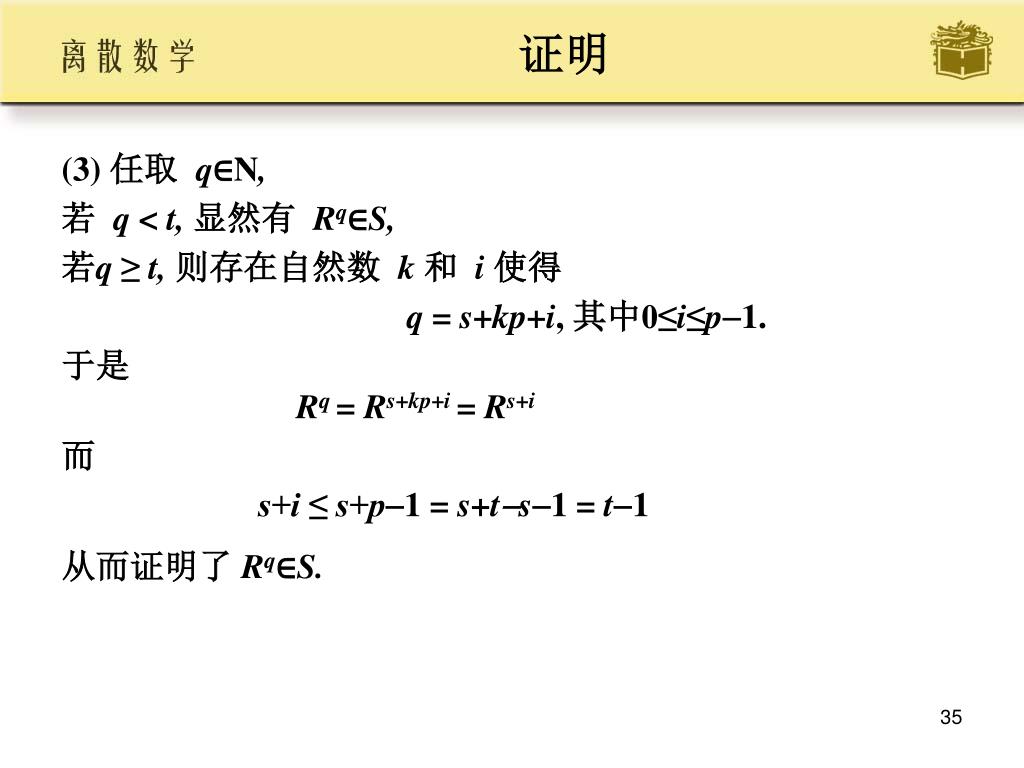 证明 • (3) 任取 q∈N, • 若 q < t,显然有 Rq∈S, • 若q ≥ t, 则存在自然数 k 和 i 使得 • q = s+kp+i, 其中0≤i≤p1. • 于是 Rq = Rs+kp+i = Rs+i • 而 • s+i ≤ s+p1 = s+ts1 = t1 • 从而证明了Rq∈S.