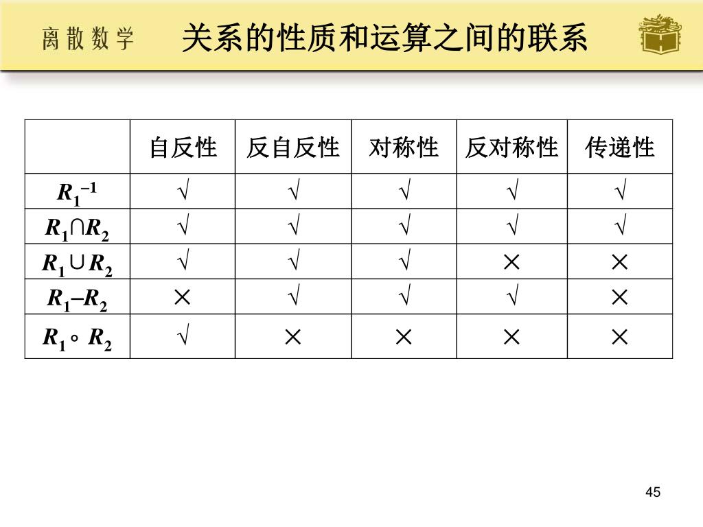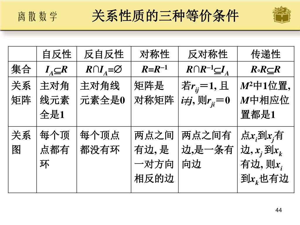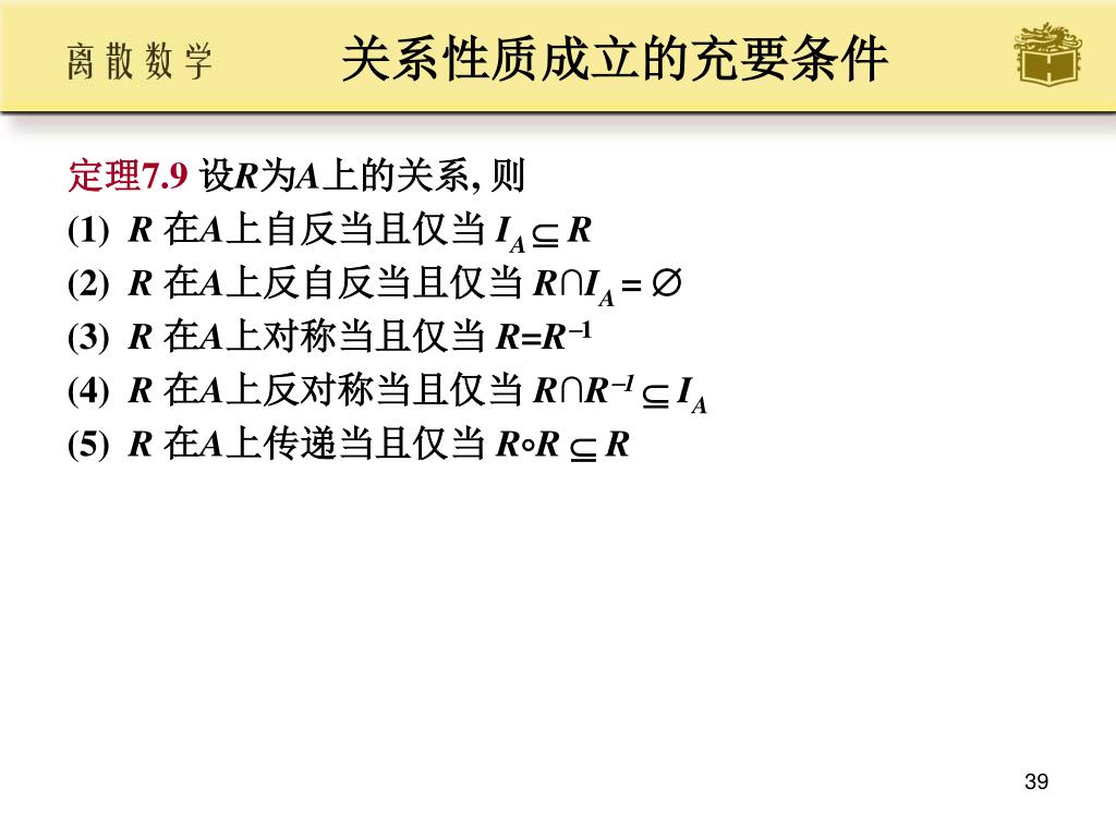 关系性质成立的充要条件 • 定理7.9设R为A上的关系, 则 • (1) R 在A上自反当且仅当IA R • (2) R 在A上反自反当且仅当R∩IA = • (3) R 在A上对称当且仅当R=R1 • (4) R 在A上反对称当且仅当R∩R1 IA • (5) R 在A上传递当且仅当RR R