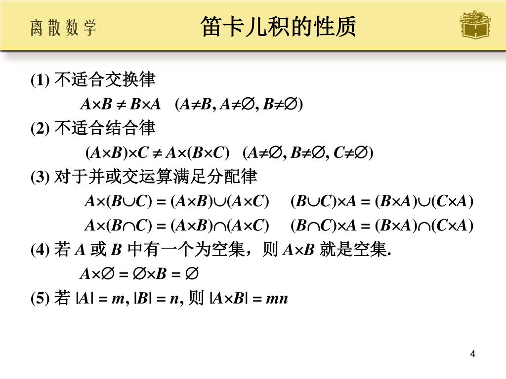 笛卡儿积的性质 • (1) 不适合交换律 • AB BA (AB, A, B) • (2) 不适合结合律 • (AB)C A(BC) (A, B, C) • (3) 对于并或交运算满足分配律 • A(BC) = (AB)(AC) (BC)A = (BA)(CA) • A(BC) = (AB)(AC) (BC)A = (BA)(CA) • (4) 若 A 或 B 中有一个为空集,则 AB 就是空集. • A = B = • (5) 若 |A| = m, |B| = n, 则 |AB| = mn