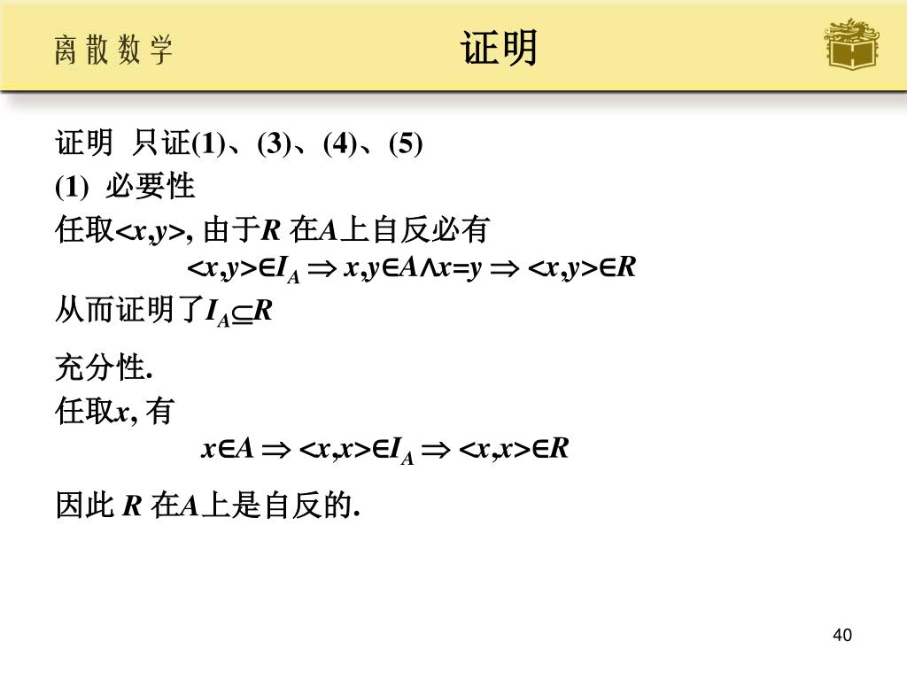 证明 • 证明 只证(1)、(3)、(4)、(5) • (1) 必要性 • 任取<x,y>, 由于R 在A上自反必有 <x,y>∈IAx,y∈A∧x=y <x,y>∈R • 从而证明了IAR • 充分性. • 任取x, 有 x∈A <x,x>∈IA <x,x>∈R • 因此 R 在A上是自反的.