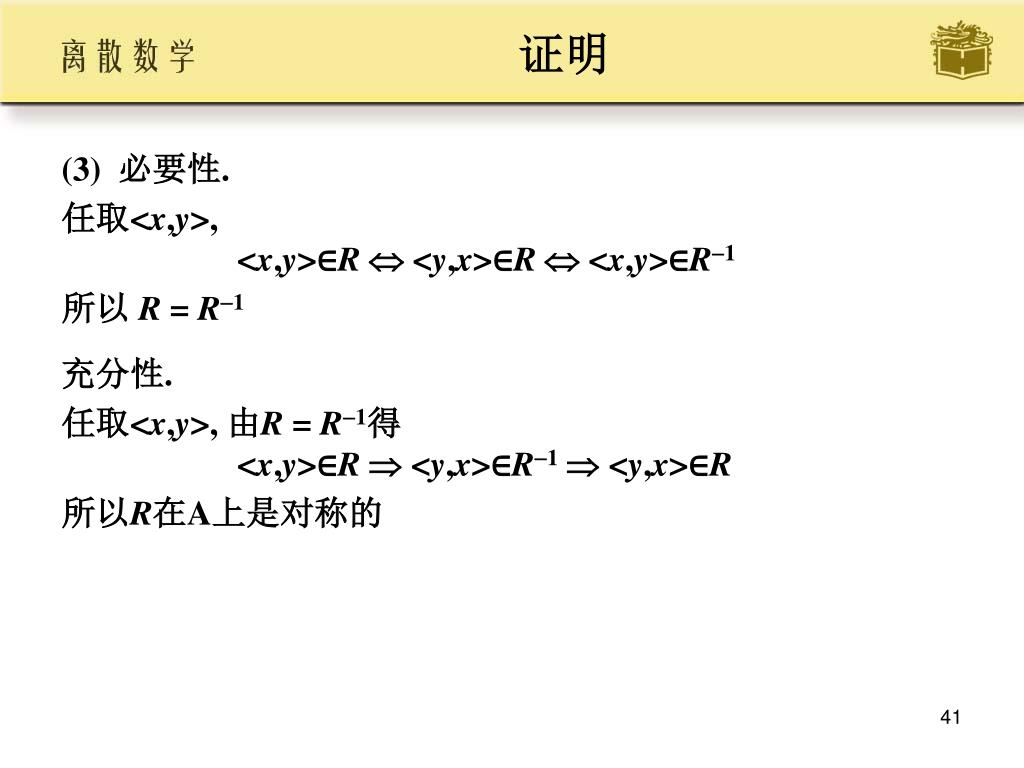 证明 • (3) 必要性. • 任取<x,y>, <x,y>∈R <y,x>∈R <x,y>∈R1 • 所以 R = R1 • 充分性. • 任取<x,y>, 由R = R1得<x,y>∈R <y,x>∈R1 <y,x>∈R • 所以R在A上是对称的