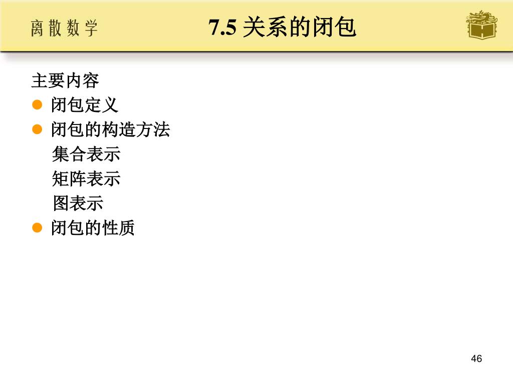 7.5 关系的闭包 • 主要内容 • 闭包定义 • 闭包的构造方法 • 集合表示 • 矩阵表示 • 图表示 • 闭包的性质