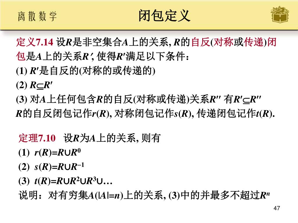 闭包定义 • 定义7.14设R是非空集合A上的关系, R的自反(对称或传递)闭 • 包是A上的关系R, 使得R满足以下条件: • (1) R是自反的(对称的或传递的) • (2) RR • (3) 对A上任何包含R的自反(对称或传递)关系R有RR • R的自反闭包记作r(R), 对称闭包记作s(R), 传递闭包记作t(R). • 定理7.10设R为A上的关系, 则有 • (1) r(R)=R∪R0 • (2) s(R)=R∪R1 • (3) t(R)=R∪R2∪R3∪… • 说明:对有穷集A(|A|=n)上的关系, (3)中的并最多不超过Rn