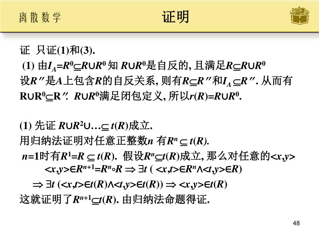 证明 • 证 只证(1)和(3). • (1) 由IA=R0R∪R0 知 R∪R0是自反的, 且满足RR∪R0 • 设R是A上包含R的自反关系, 则有RR和IA R. 从而有 • R∪R0R. R∪R0满足闭包定义, 所以r(R)=R∪R0. • (1) 先证 R∪R2∪… t(R)成立. • 用归纳法证明对任意正整数n 有Rn t(R). • n=1时有R1=R t(R). 假设Rnt(R)成立, 那么对任意的<x,y> <x,y>∈Rn+1=RnR t ( <x,t>∈Rn∧<t,y>∈R) • t (<x,t>∈t(R)∧<t,y>∈t(R)) <x,y>∈t(R) • 这就证明了Rn+1t(R). 由归纳法命题得证.