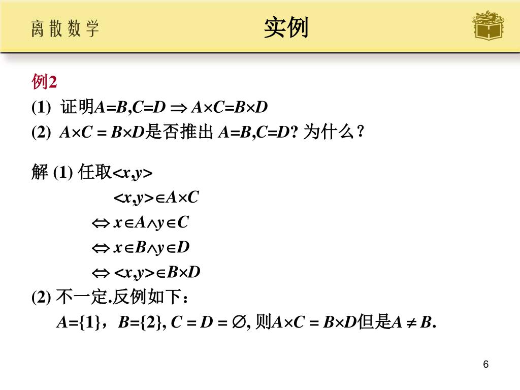 实例 • 例2 • (1) 证明A=B,C=D AC=BD • (2) AC = BD是否推出 A=B,C=D? 为什么? • 解 (1) 任取<x,y> • <x,y>AC • xAyC • xByD • <x,y>BD • (2) 不一定.反例如下: • A={1},B={2}, C = D = , 则AC = BD但是A B.