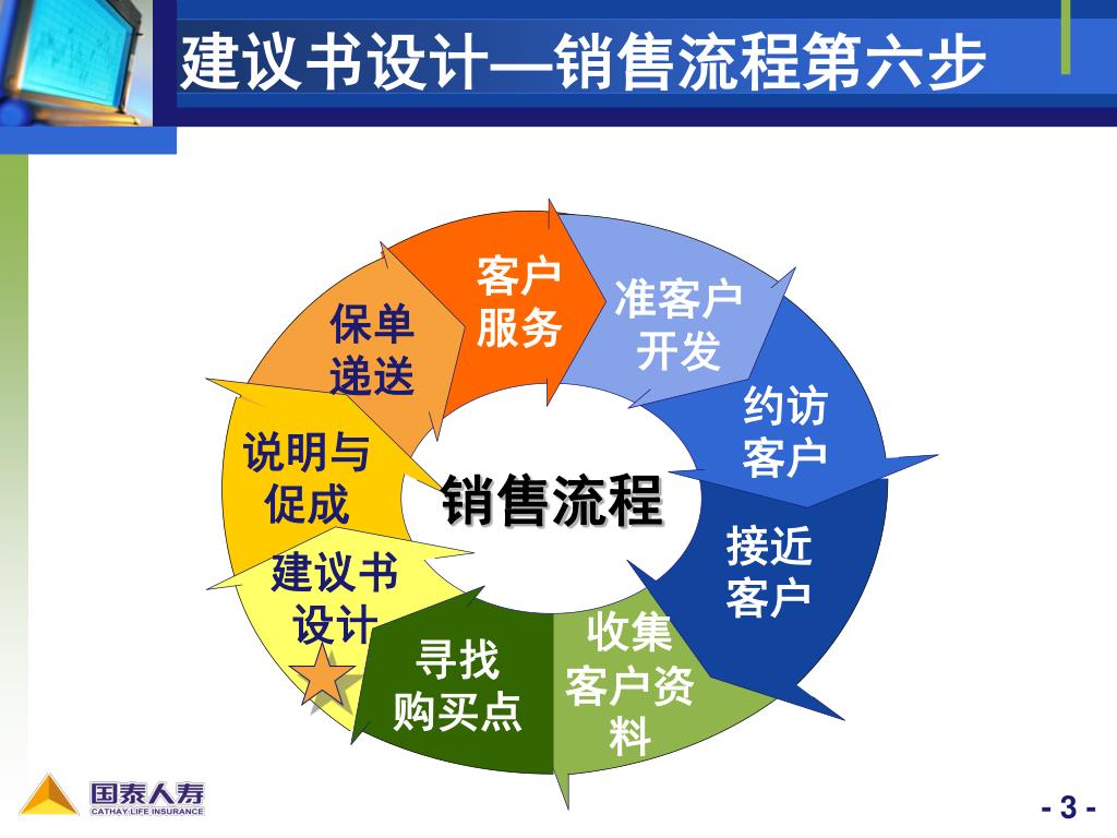 销售流程 —— 建议书设计. 学习 目标. 1. 掌握建议书设计的基本原理和流程,设计出适合保户的建议书 2. 学会制作建议书。. 客户 服务. 准客户 开发. 保单 递送. 约访 客户. 说明与 促成. 销售流程. 接近 客户. 建议书 设计. 收集 客户资料. 寻找 购买点. 建议书设计 — 销售流程第六步. 建议书设计流程. 依据客户需求与保费预算. 选择适合客户的商品. 制作建议书. 检讨建议方案是否恰当. 完成建议书设计. ?. 依据客户需求与保费预算. 保额满足出险后的现金需求. 原则一.