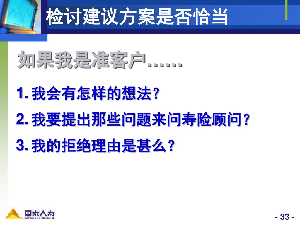 检讨建议方案是否恰当 如果我是准客户…… • 我会有怎样的想法? • 我要提出那些问题来问寿险顾问? • 我的拒绝理由是甚么? ?