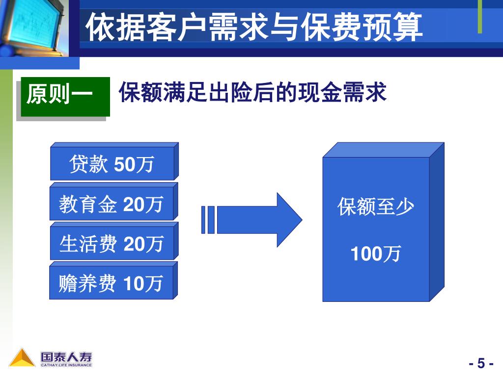 依据客户需求与保费预算 保额满足出险后的现金需求 原则一 贷款 50万 保额至少 100万 教育金 20万 生活费 20万 赡养费 10万