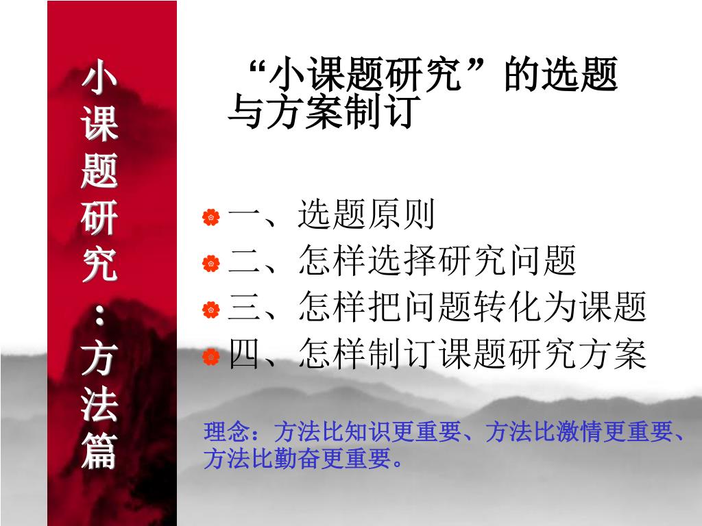 小课题研究:方法篇 “小课题研究”的选题与方案制订 • 一、选题原则 • 二、怎样选择研究问题 • 三、怎样把问题转化为课题 • 四、怎样制订课题研究方案 理念:方法比知识更重要、方法比激情更重要、方法比勤奋更重要。