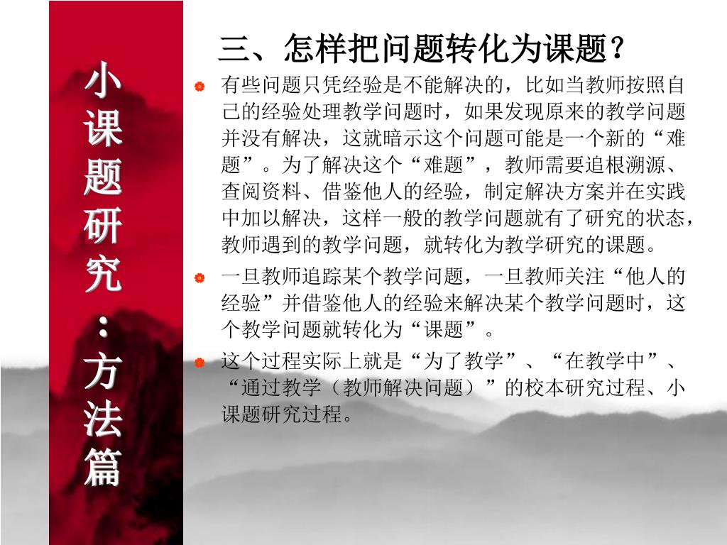 小课题研究:方法篇 三、怎样把问题转化为课题? • 问题转化为课题,就是在找准自身教育教学中存在的问题基础上建立课题。小课题研究就是要解决教育教学中存在的各种具体问题。 • 在确定课题前,要回顾反思,注重思考,把找准问题作为确定好课题的前提条件,把立好课题作为发现问题、分析问题、解决过程的思考过程。例如:当前在课堂教学中普遍存在并迫切需要解决的问题是:如何让课堂教学既开放又有序?如何对待学生间的差异?如何捕捉有利的教学时机?课堂教学中如何对待学生的不同意见?如何实施课堂教学评价?这些问题既是课堂教学的现实问题,也是需要教师研究的课题,把解决问题和课题研究紧密结合,既能提高教师的问题意识,也能提高教师的分析、研究和解决问题的能力。