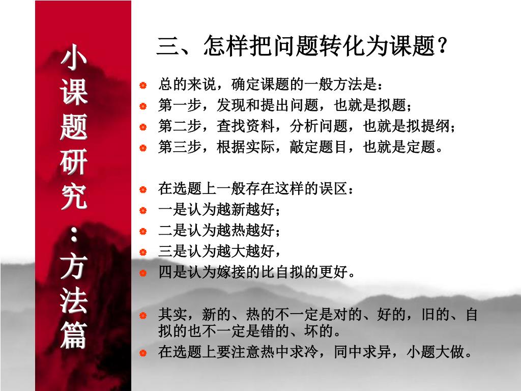 小课题研究:方法篇 三、怎样把问题转化为课题? • 总的来说,确定课题的一般方法是: • 第一步,发现和提出问题,也就是拟题; • 第二步,查找资料,分析问题,也就是拟提纲; • 第三步,根据实际,敲定题目,也就是定题。 • 在选题上一般存在这样的误区: • 一是认为越新越好; • 二是认为越热越好; • 三是认为越大越好, • 四是认为嫁接的比自拟的更好。 • 其实,新的、热的不一定是对的、好的,旧的、自拟的也不一定是错的、坏的。 • 在选题上要注意热中求冷,同中求异,小题大做。