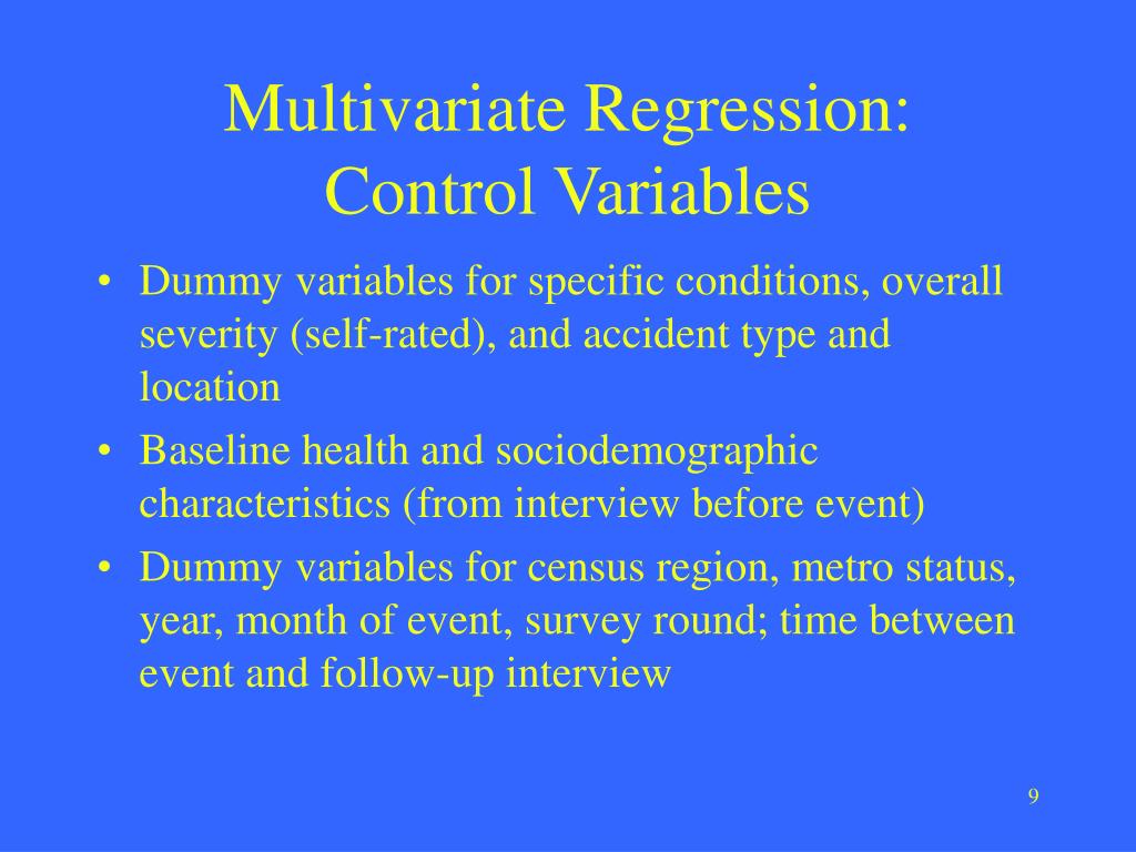 Multivariate Regression:Control Variables • Dummy variables for specific conditions, overall severity (self-rated), and accident type and location • Baseline health and sociodemographic characteristics (from interview before event) • Dummy variables for census region, metro status, year, month of event, survey round; time between event and follow-up interview