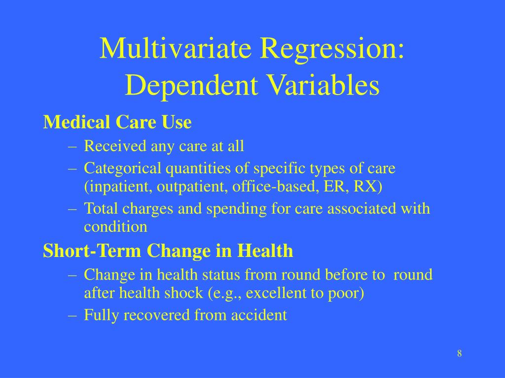 Multivariate Regression: Dependent Variables Medical Care Use • Received any care at all • Categorical quantities of specific types of care (inpatient, outpatient, office-based, ER, RX) • Total charges and spending for care associated with condition Short-Term Change in Health • Change in health status from round before to round after health shock (e.g., excellent to poor) • Fully recovered from accident