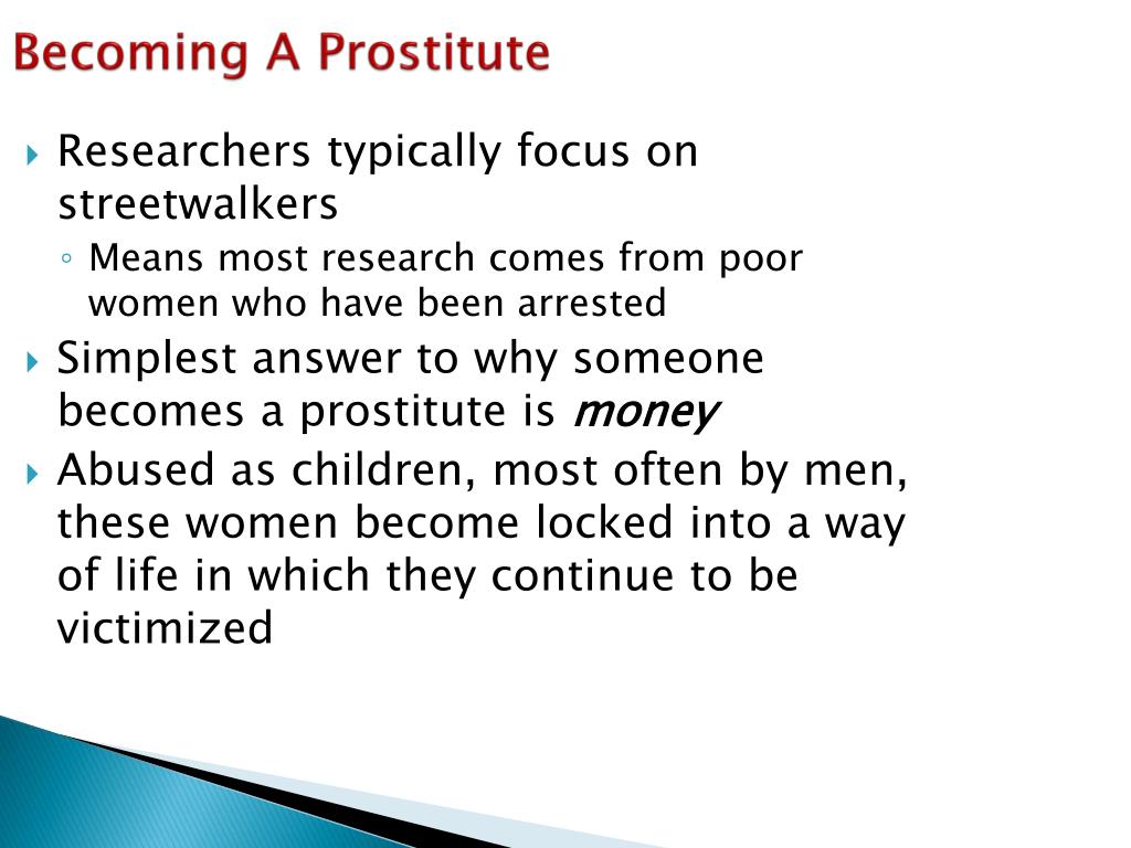 Becoming A Prostitute • Researchers typically focus on streetwalkers • Means most research comes from poor women who have been arrested • Simplest answer to why someone becomes a prostitute is money • Abused as children, most often by men, these women become locked into a way of life in which they continue to be victimized
