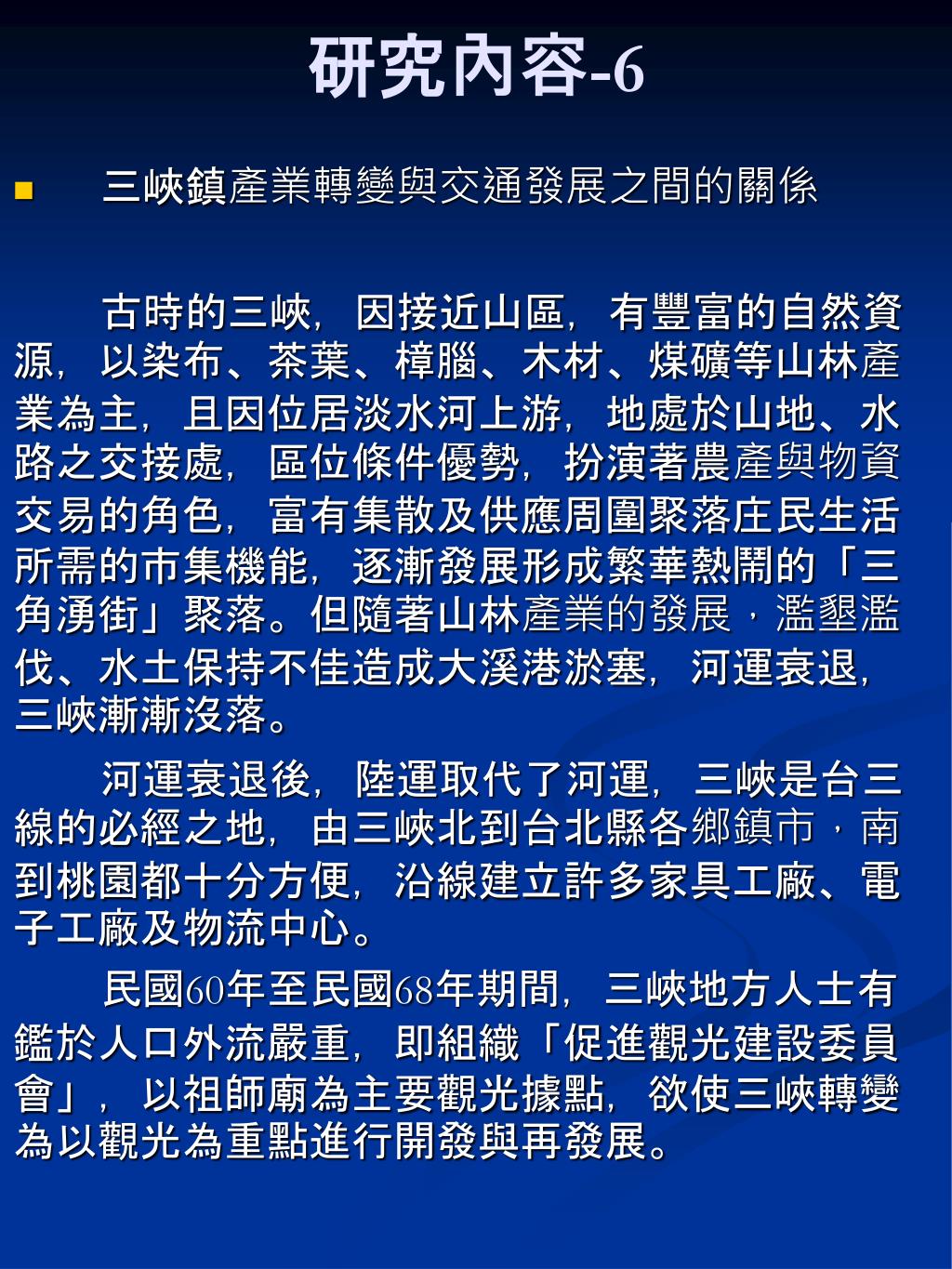 研究內容-6 • 三峽鎮產業轉變與交通發展之間的關係 古時的三峽,因接近山區,有豐富的自然資源,以染布、茶葉、樟腦、木材、煤礦等山林產業為主,且因位居淡水河上游,地處於山地、水路之交接處,區位條件優勢,扮演著農產與物資交易的角色,富有集散及供應周圍聚落庄民生活所需的市集機能,逐漸發展形成繁華熱鬧的「三角湧街」聚落。但隨著山林產業的發展,濫墾濫伐、水土保持不佳造成大溪港淤塞,河運衰退,三峽漸漸沒落。 河運衰退後,陸運取代了河運,三峽是台三線的必經之地,由三峽北到台北縣各鄉鎮市,南到桃園都十分方便,沿線建立許多家具工廠、電子工廠及物流中心。 民國60年至民國68年期間,三峽地方人士有鑑於人口外流嚴重,即組織「促進觀光建設委員會」,以祖師廟為主要觀光據點,欲使三峽轉變為以觀光為重點進行開發與再發展。
