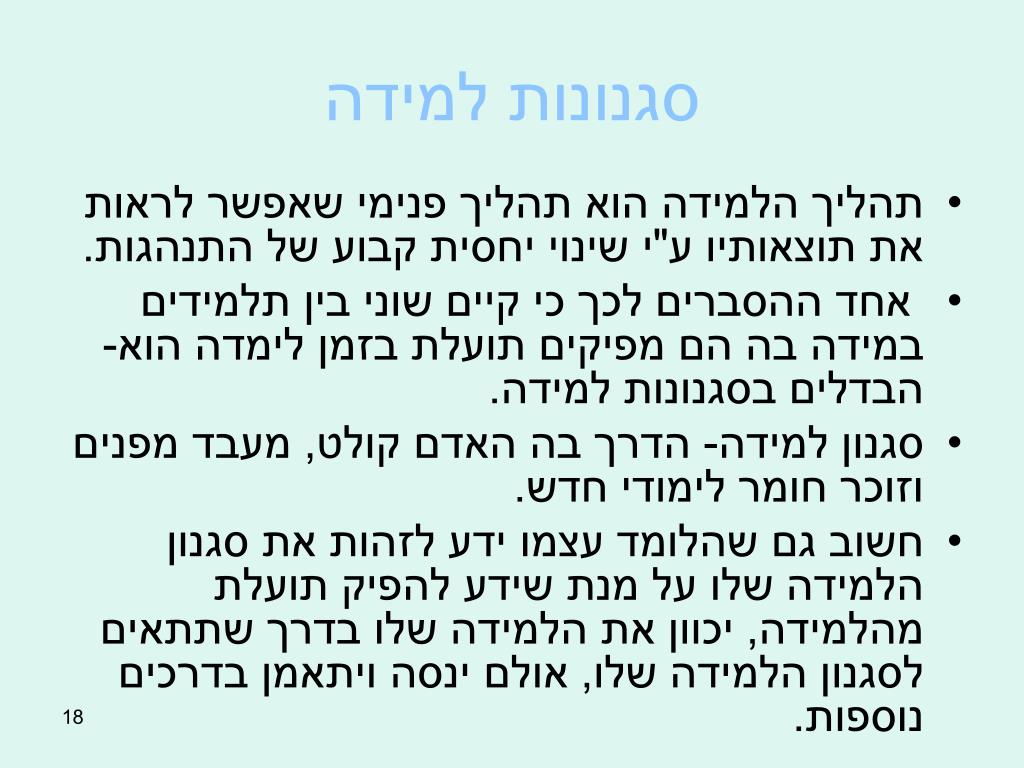 סגנונות למידה • תהליך הלמידה הוא תהליך פנימי שאפשר לראות את תוצאותיו ע"י שינוי יחסית קבוע של התנהגות. • אחד ההסברים לכך כי קיים שוני בין תלמידים במידה בה הם מפיקים תועלת בזמן לימדה הוא- הבדלים בסגנונות למידה. • סגנון למידה- הדרך בה האדם קולט, מעבד מפנים וזוכר חומר לימודי חדש. • חשוב גם שהלומד עצמו ידע לזהות את סגנון הלמידה שלו על מנת שידע להפיק תועלת מהלמידה, יכוון את הלמידה שלו בדרך שתתאים לסגנון הלמידה שלו, אולם ינסה ויתאמן בדרכים נוספות.
