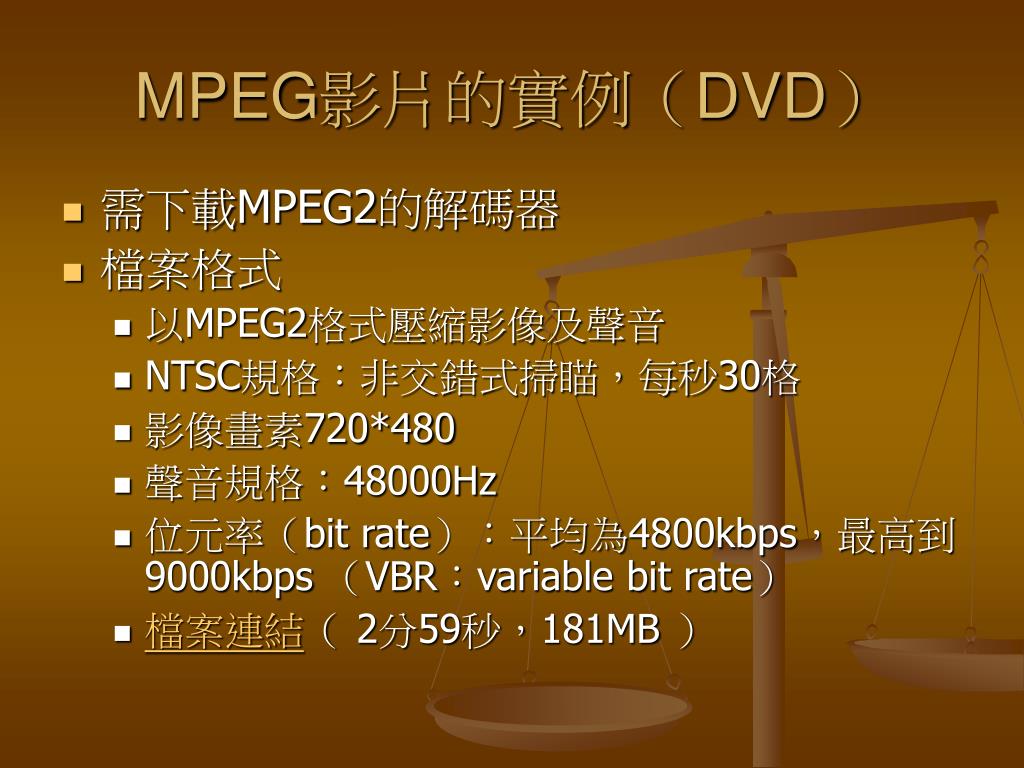 MPEG影片的實例(DVD) • 需下載MPEG2的解碼器 • 檔案格式 • 以MPEG2格式壓縮影像及聲音 • NTSC規格:非交錯式掃瞄,每秒30格 • 影像畫素720*480 • 聲音規格:48000Hz • 位元率(bit rate):平均為4800kbps,最高到9000kbps (VBR:variable bit rate) • 檔案連結( 2分59秒,181MB )