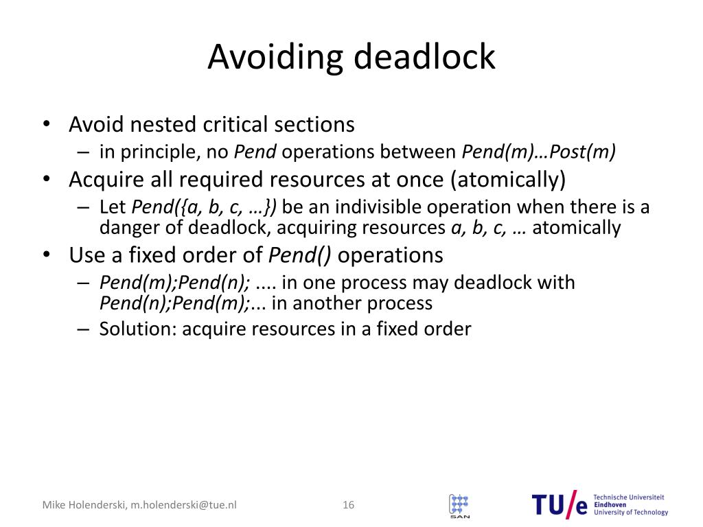 Avoiding deadlock • Avoid nested critical sections • in principle, no Pend operations between Pend(m)…Post(m) • Acquire all required resources at once (atomically) • Let Pend({a, b, c, …}) be an indivisible operation when there is a danger of deadlock, acquiring resources a, b, c, … atomically • Use a fixed order of Pend() operations • Pend(m);Pend(n); .... in one process may deadlock with Pend(n);Pend(m);... in another process • Solution: acquire resources in a fixed order