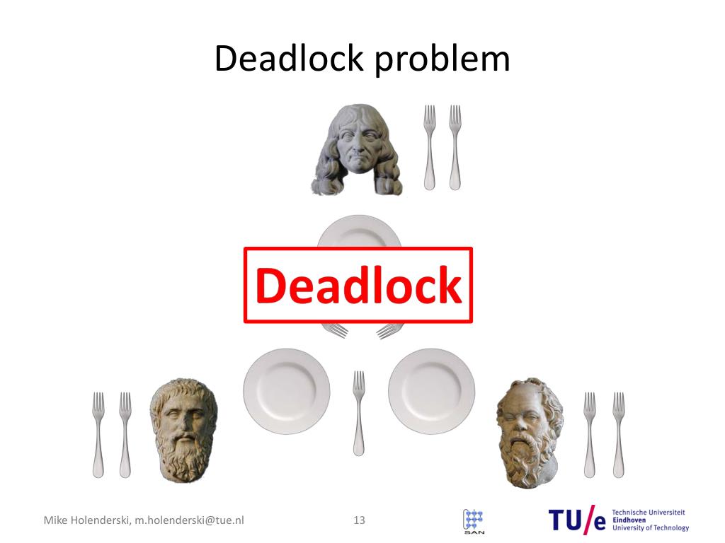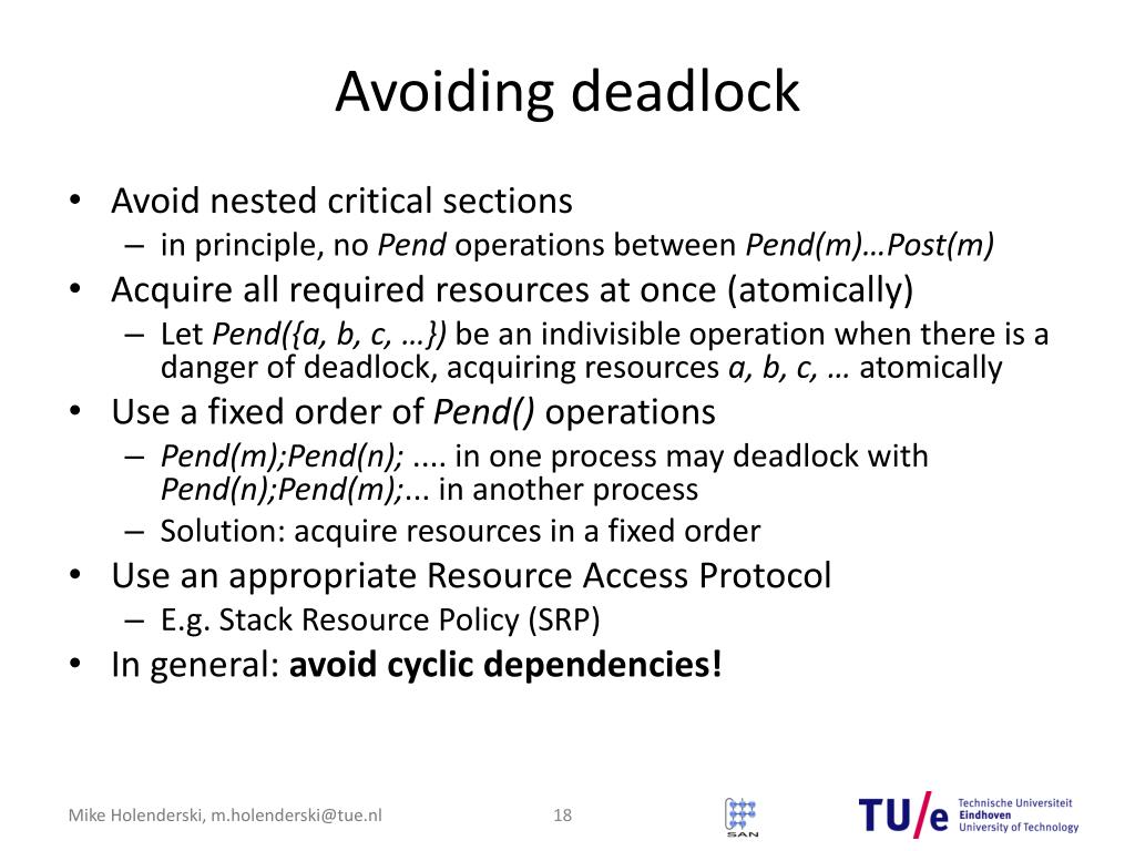 Avoiding deadlock • Avoid nested critical sections • in principle, no Pend operations between Pend(m)…Post(m) • Acquire all required resources at once (atomically) • Let Pend({a, b, c, …}) be an indivisible operation when there is a danger of deadlock, acquiring resources a, b, c, … atomically • Use a fixed order of Pend() operations • Pend(m);Pend(n); .... in one process may deadlock with Pend(n);Pend(m);... in another process • Solution: acquire resources in a fixed order • Use an appropriate Resource Access Protocol • E.g. Stack Resource Policy (SRP) • In general: avoid cyclic dependencies!