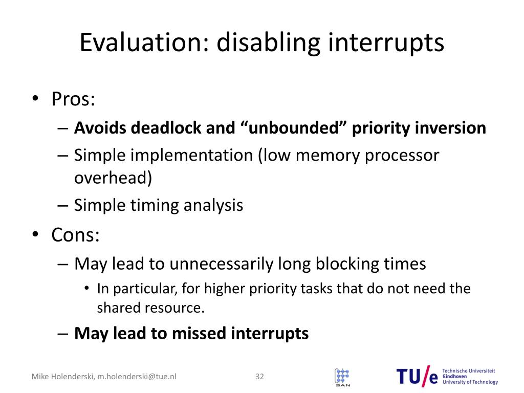 Evaluation: disabling interrupts • Pros: • Avoids deadlock and “unbounded” priority inversion • Simple implementation (low memory processor overhead) • Simple timing analysis • Cons: • May lead to unnecessarily long blocking times • In particular, for higher priority tasks that do not need the shared resource. • May lead to missed interrupts