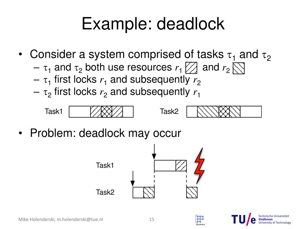 Example: deadlock • Consider a system comprised of tasks 1 and 2 • 1 and 2 both use resources r1 and r2 • 1 first locks r1 and subsequently r2 • 2 first locks r2 and subsequently r1 • Problem: deadlock may occur