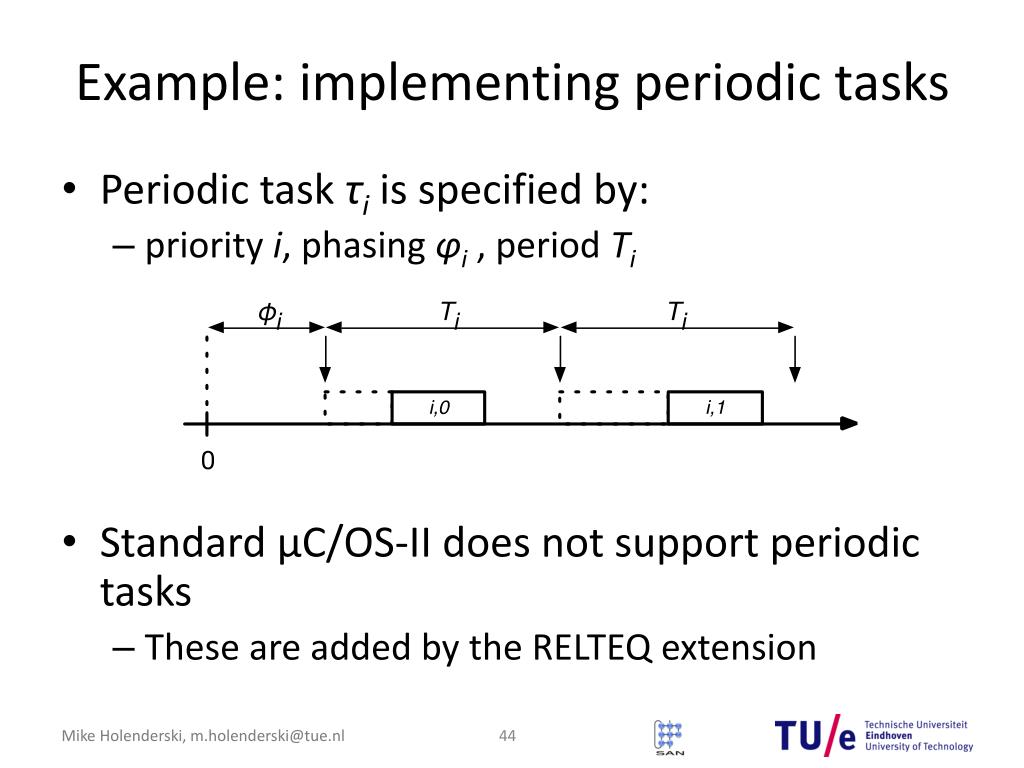 Example: implementing periodic tasks • Periodic task τi is specified by: • priority i, phasing φi , period Ti • Standard μC/OS-II does not support periodic tasks • These are added by the RELTEQ extension